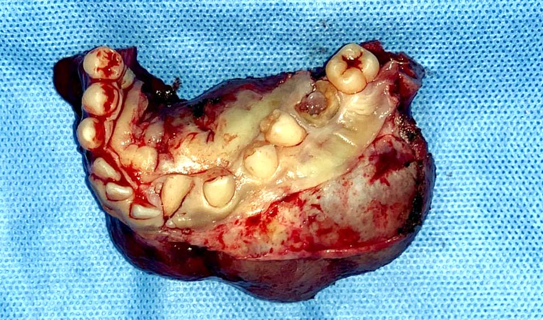 El paciente presentaba movilidad dental múltiple, dolor a la palpación, limitación en la apertura bucal, dificultad para masticar y una notable asimetría facial con abultamiento mandibular. Ante la progresión del cuadro clínico, se decidió un abordaje quirúrgico especializado para preservar la función mandibular y la armonía facial.