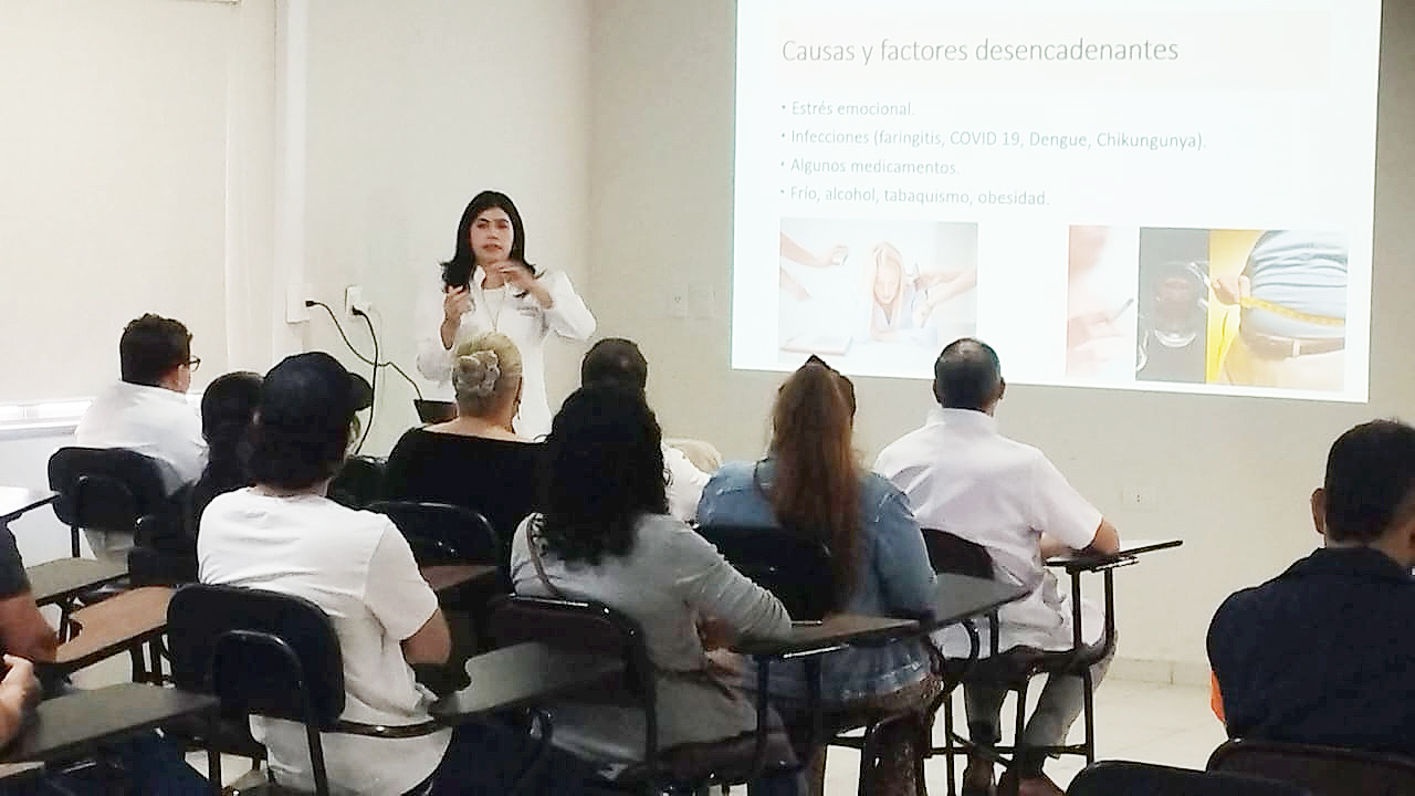 Noemí Da Ponte, médica dermatóloga de la Policlínica IPS Ingavi inicio una presentación dirigida a pacientes y familiares hablando sobre la psoriasis esta enfermedad cutánea inflamatoria crónica y recidivante caracterizada por la presencia de placas eritematosas bien delimitadas de diversos tamaños y formas generalmente están cubiertas por escamas secas adherentes y de color plateado.