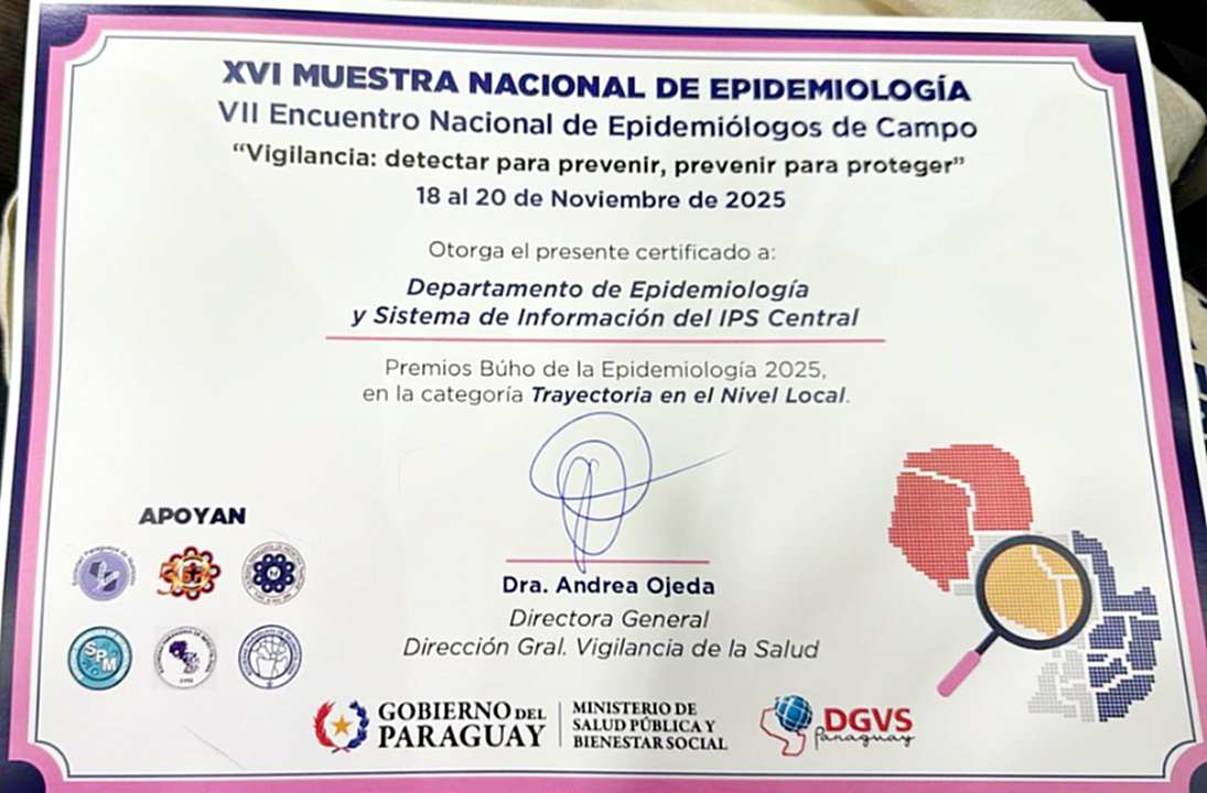 En el marco de la XVI Muestra Nacional de Epidemiología y VI Encuentro Nacional de Epidemiólogos de Campo, el Departamento de Epidemiología y Sistema de Información del IPS Central fue distinguido con un importante reconocimiento por su destacada trayectoria y compromiso en el nivel local, reafirmando su rol fundamental dentro del sistema de vigilancia sanitaria del país.