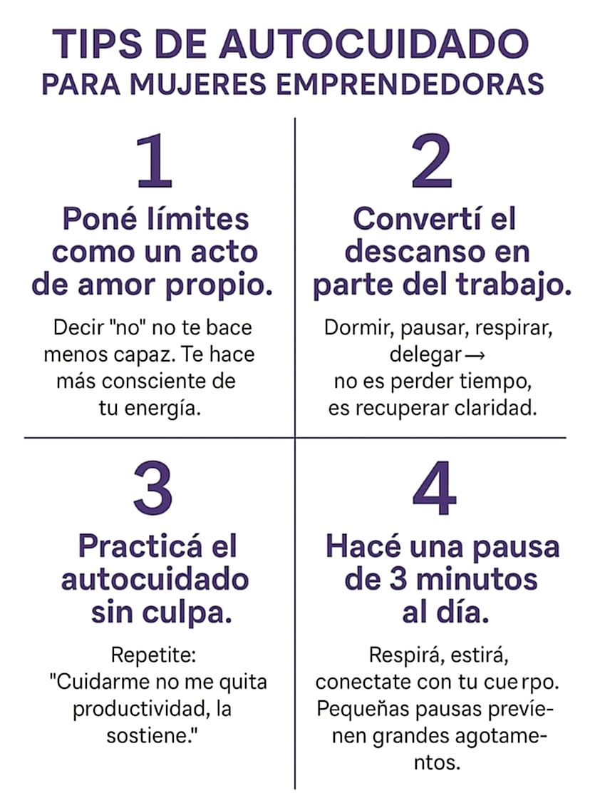 “Desde la psicología sabemos que una mujer emprendedora atraviesa desafíos particulares: la presión por rendir, la auto exigencia, la idea de tener que “poder con todo”, el miedo a equivocarse, la desigualdad de oportunidades y muchas veces, la invisibilidad emocional”.