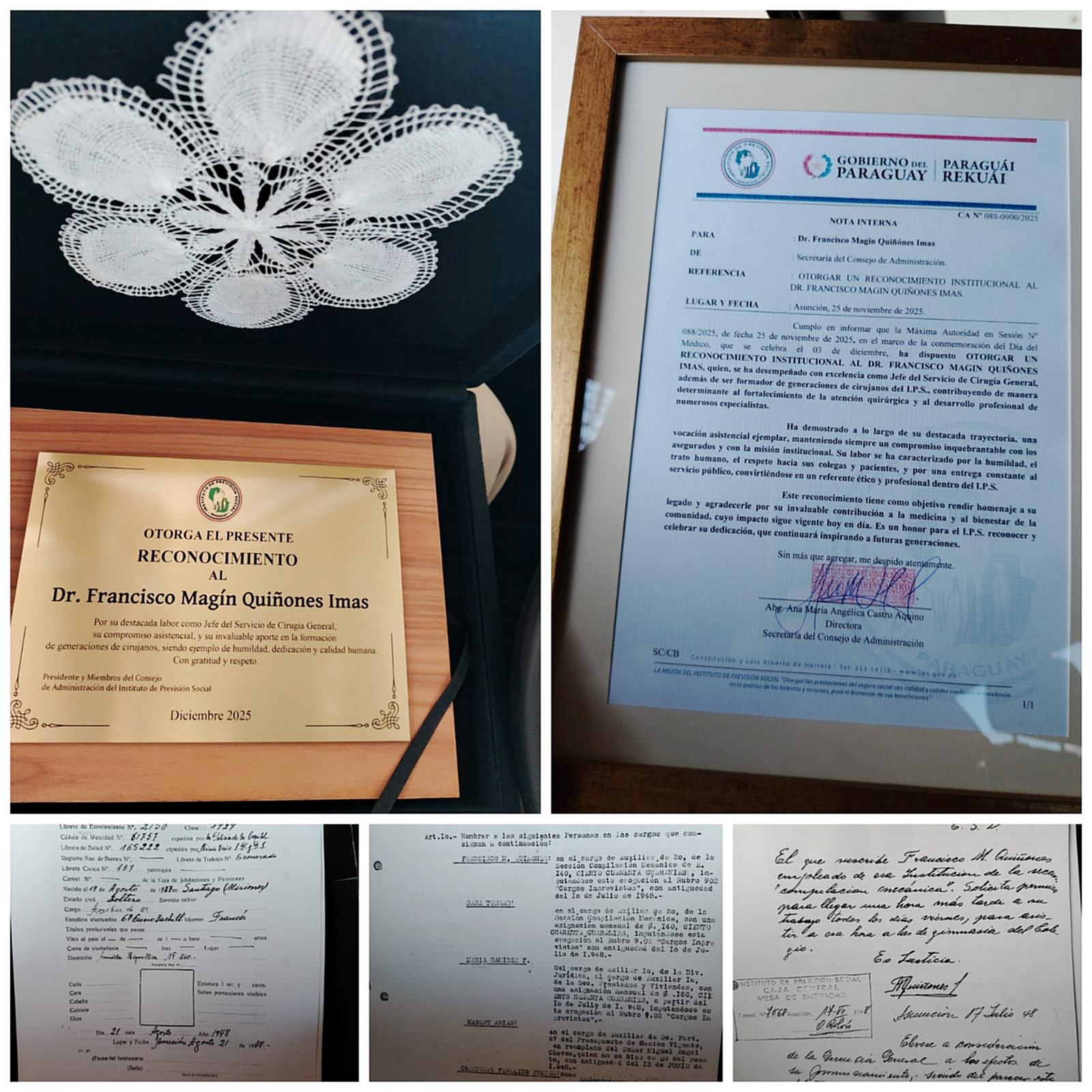 El Dr. Quiñónez se jubiló en 1987, luego de una trayectoria que inició alrededor de 1948 en el IPS. Tras su retiro, se trasladó a su residencia en Misiones, donde actualmente enfrenta algunas dolencias propias de la edad. Del emotivo homenaje participaron también el Dr. Martín Berdem y el Dr. Alberto Cardozo, ambos formados bajo la guía y maestría del reconocido cirujano. Igualmente acompañaron la comitiva el Dr. Gustavo Gonzalez, consejero repressentante del Ministerio de Salud y el jefe de Gabinete Luis Cardozo.