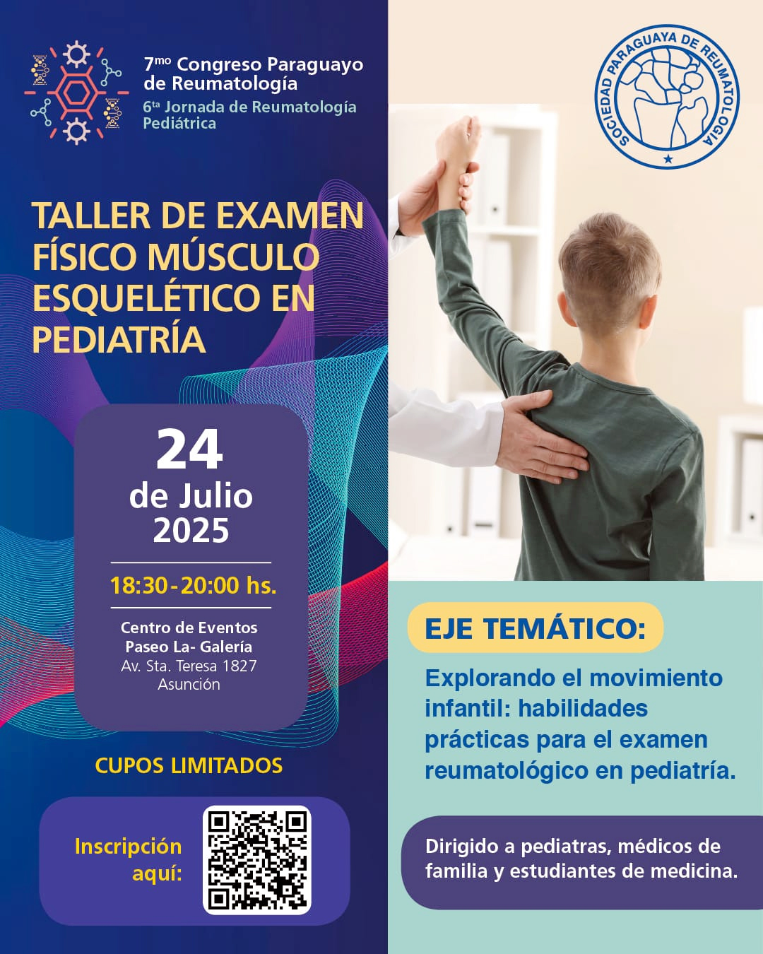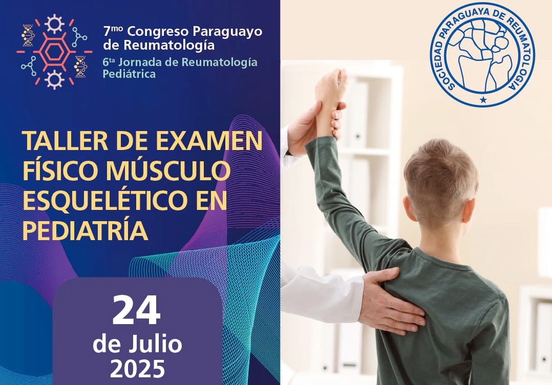 El Taller de Examen Físico Músculo Esquelético en Pediatría se desarrollará el 24 de julio del 2025 en el marco de del VII Congreso Paraguayo de Reumatología y la VI Jornada de Reumatología Pediátrica.