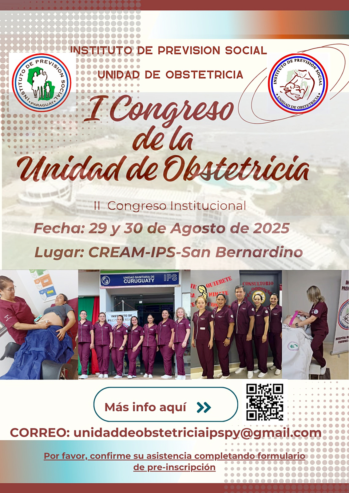 El Instituto de Previsión Social organiza el I Congreso de la Unidad de Obstetricia, un encuentro académico y profesional que busca fortalecer la atención materno-infantil en el país. El evento se llevará a cabo los días 29 y 30 de agosto de 2025 en el CREAM-IPS de San Bernardino, con la participación de destacados especialistas nacionales.