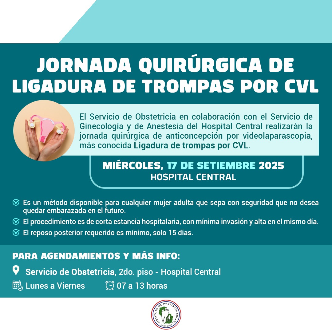 El próximo 17 de setiembre en el Hospital Central se desarrollará una nueva jornada quirúrgica de anticoncepción por videolaparascopia más conocida como ligadura de trompas por CVL.