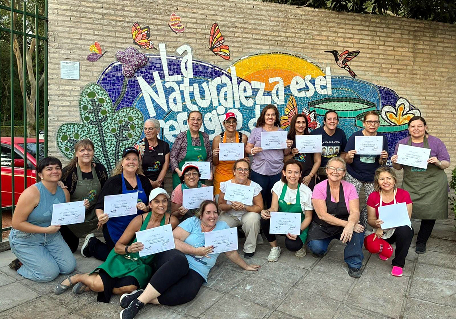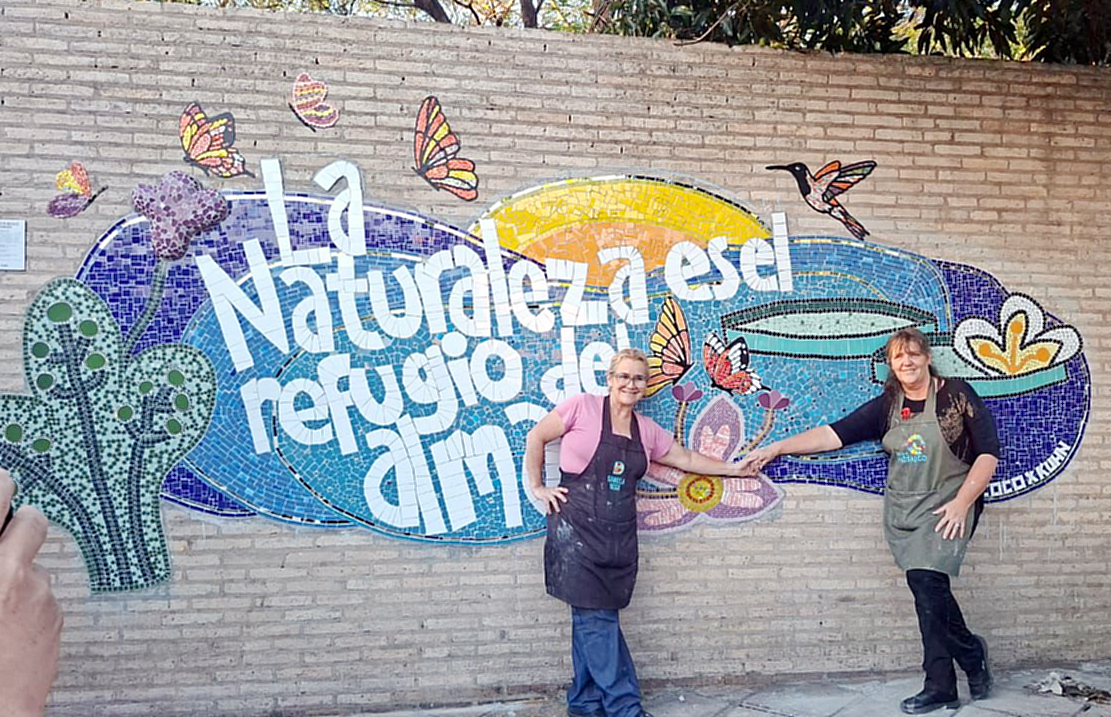 Silvia Kuhn y Daniela Vega reconocidas muralistas con amplia trayectoria, encabezaron el taller donde los participantes aprendieron la técnica del mosaico artístico, uniendo piezas, colores y texturas para dar forma a una creación única. Las artistas destacaron que el proyecto fue concebido bajo altos estándares de calidad, utilizando azulejos, vidrios, espejos y materiales resistentes, garantizando una obra duradera y vibrante que convivirá en armonía con el entorno natural del lugar.