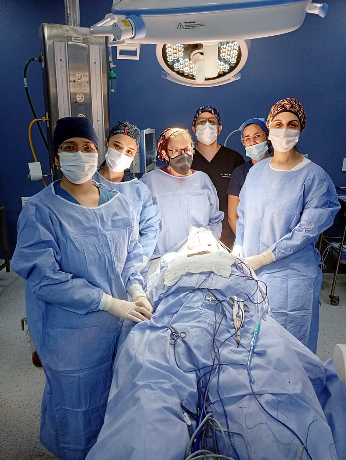 El equipo quirúrgico estuvo compuesto por cirujanas de Cabeza y Cuello liderado por la Dra. Marta Osorio, Dra. Lisa Argüello las residentes de Cirugía General Dra. Liz Irala, Dra. Nicole Noé el anestesiólogo Dr. César Brítez y la Lic. Malena Peters.