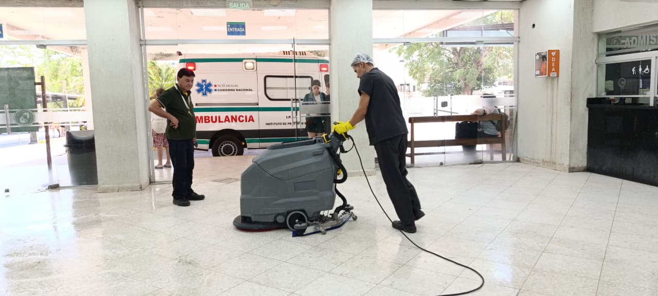 Este lunes 2 de febrero se realizó un trabajo de limpieza mecanizada de pisos en el Hospital Central, el cual forma parte de un contrato de gestión ambiental enfocado en mejorar la higiene, seguridad y circulación de las personas. Estas tareas buscan la desinfección profunda y el mantenimiento de superficies en las cuales se estima que aproximadamente unas 12 mil personas ingresan diariamente a la previsional.