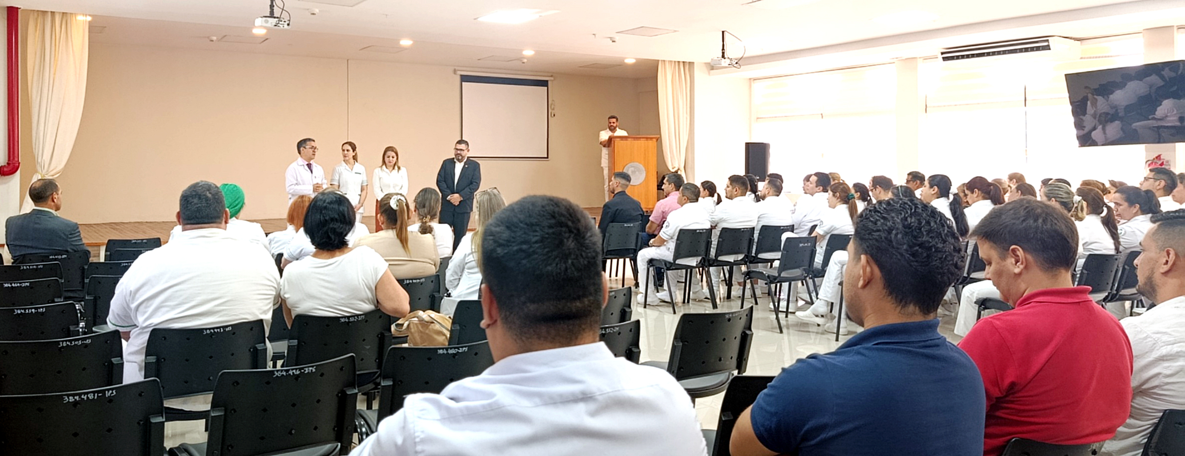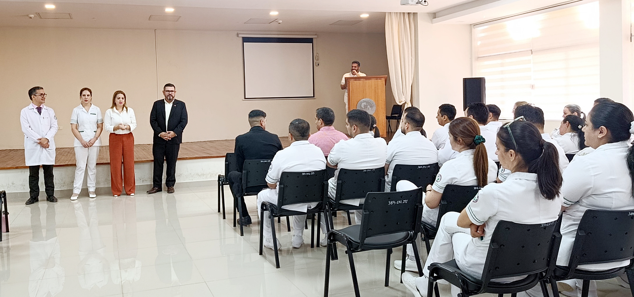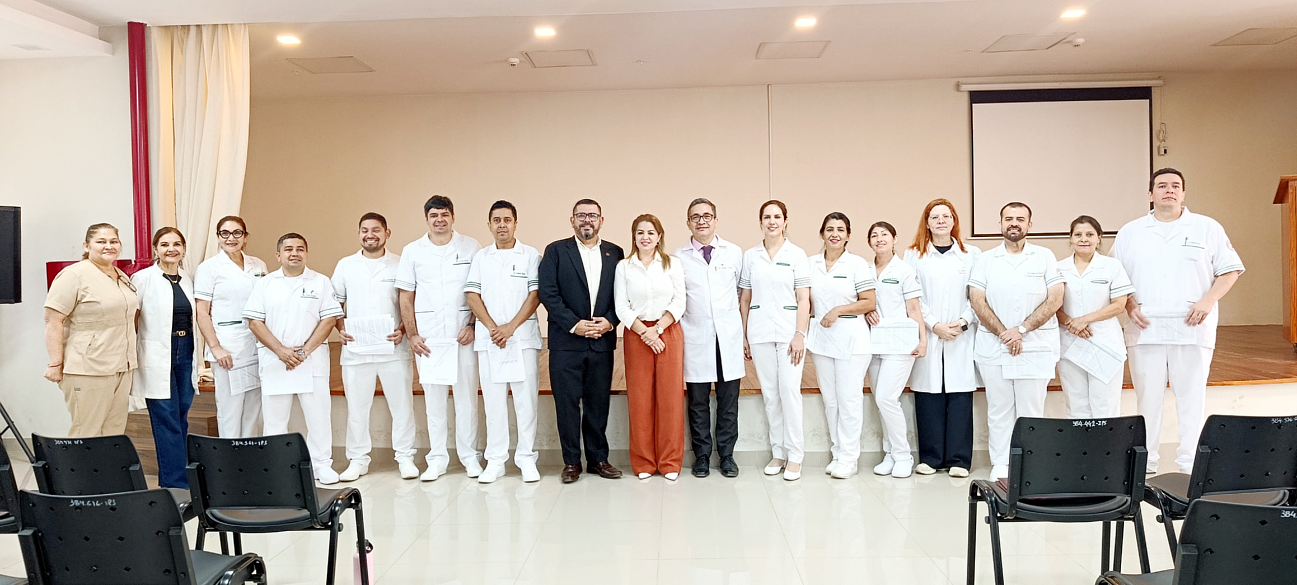 El acto se realizó en el salón auditorio ubicado en el octavo piso de la previsional con presencia de autoridades como el Dr. Edgar Ortega, director del Hospital Central; Dr. Marcos Martínez, director de Apoyo y Servicios; Mgtr. Marina Barrios, directora de Enfermería del IPS; Lic. Evelyn Alcaraz, jefa del Dpto. de Enfermería del Hospital Central; Lic. Carlos Cáceres, coordinador de Apoyo y Servicios, jefes de departamentos y servicios, médicos, personal de enfermería, entre otros.