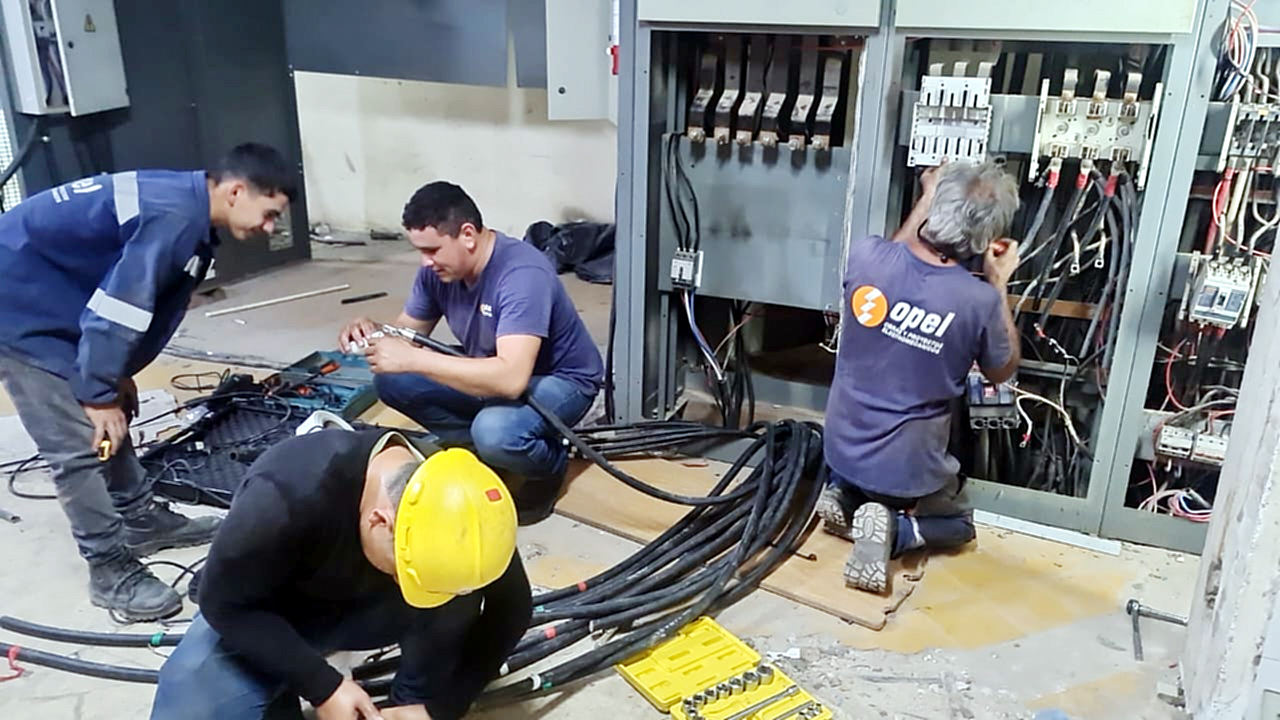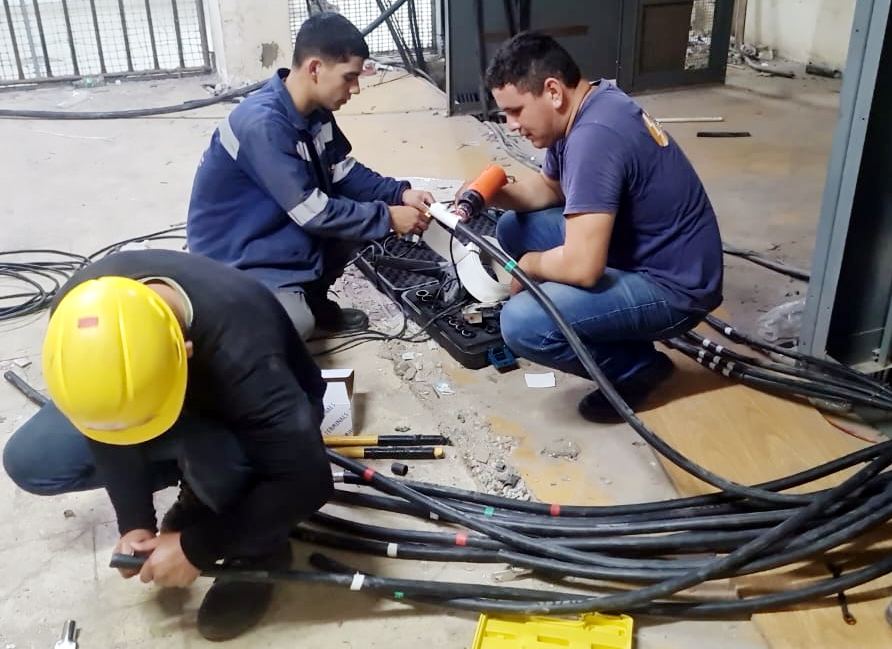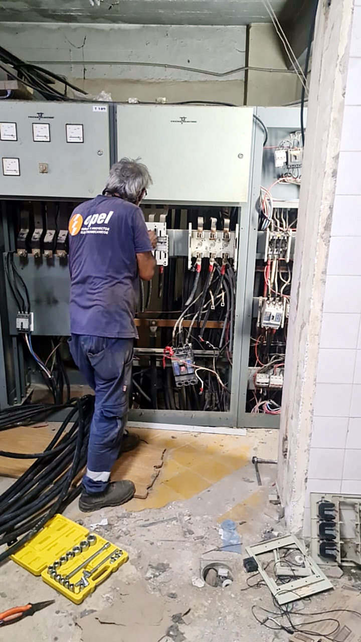 Según la Ingeniera Verónica Blanco, directora de mantenimiento del IPS, el personal técnico está trabajando en la instalación de los nuevos conductores eléctricos que alimentarán el puesto de distribución, realizando las conexiones al tablero principal.