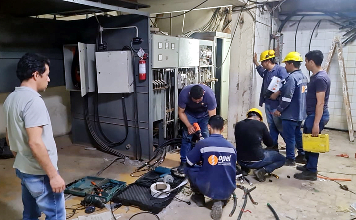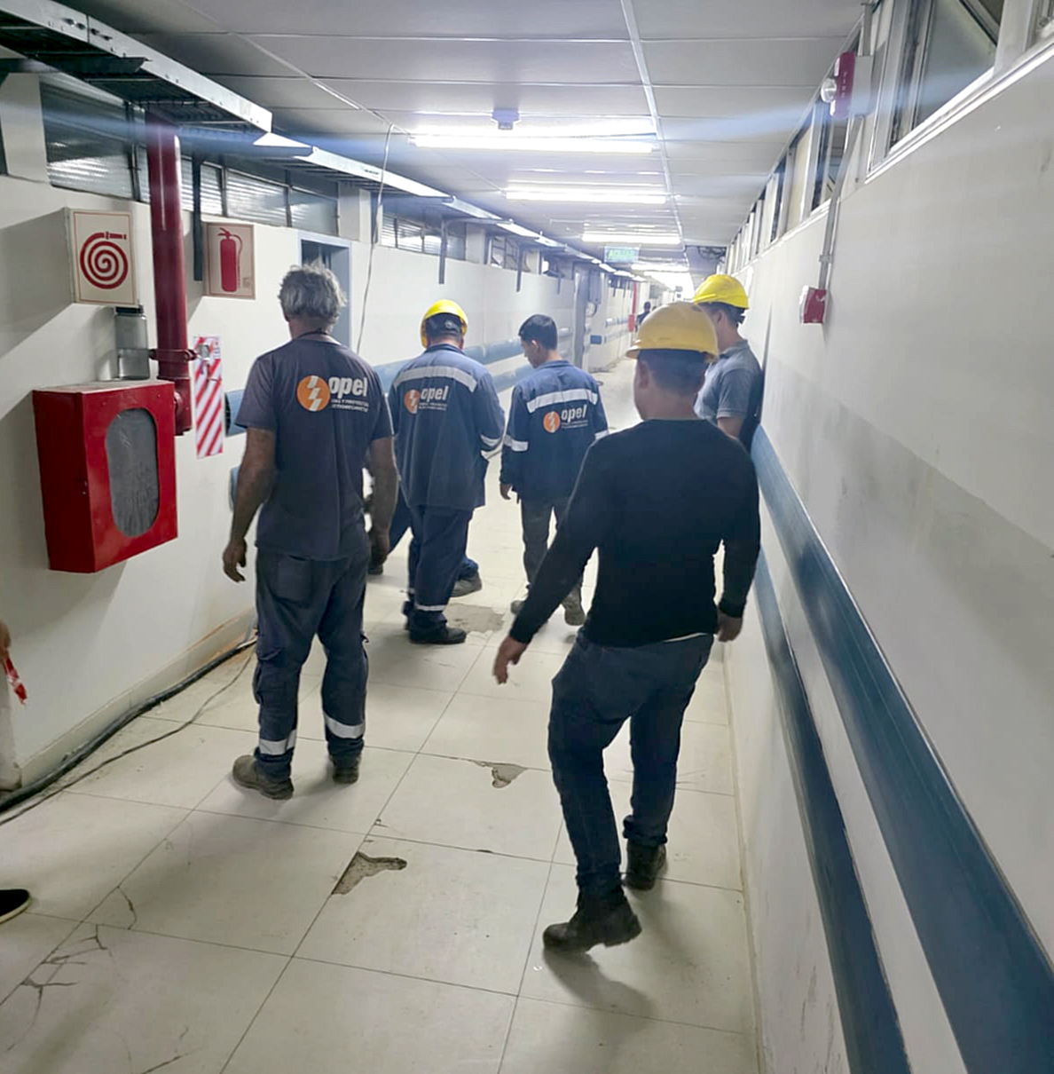 Técnicos del equipo de mantenimiento del Hospital Central y personal de la empresa contratista, trabajan arduamente para reponer la fluidez de la energía eléctrica del Hospital Central.